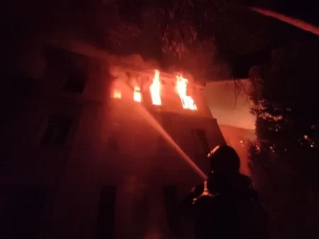 Як повідомляють місцеві пабліки, публікуючи матеріали з місця події, палав у будівлі дах та верхній поверх.