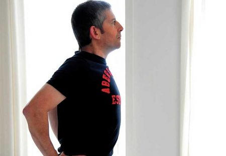 Плечі відтягніть назад і вниз, руки на стегнах, груди вгору і вперед. Зробіть 3-4 глибоких вдихи і видихи. Ви маєте відчути, як подовжуються м’язи грудей.
