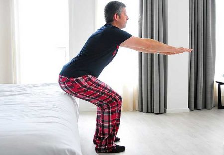 Як тільки ви торкнетеся ліжка, підніміться і повторіть. Виконайте від 8 до 10 повільних присідань.
