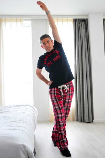 Підніміть ліву руку і потягніться до правого боку. Зробіть 3-4 глибоких вдихи і видихи. Ви маєте відчути, як розтягується бік. Повторіть, змінивши положення рук та ніг.