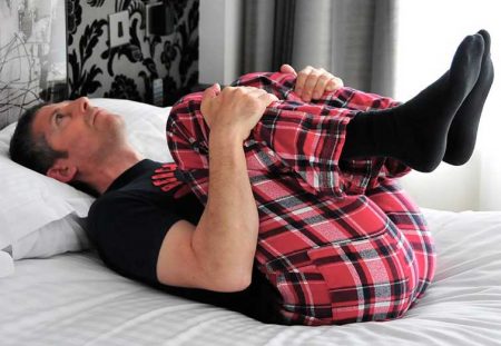 Піднесіть одне коліно до грудей, другу ногу тримайте зігнутою. Не піднімайте голову і не напружуйте шию.
