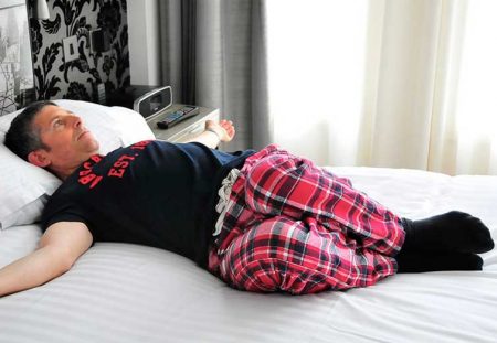 Другу ногу тримайте на ліжку рівною або зігнутою. Зробіть 3-4 глибоких вдихи та видихи.