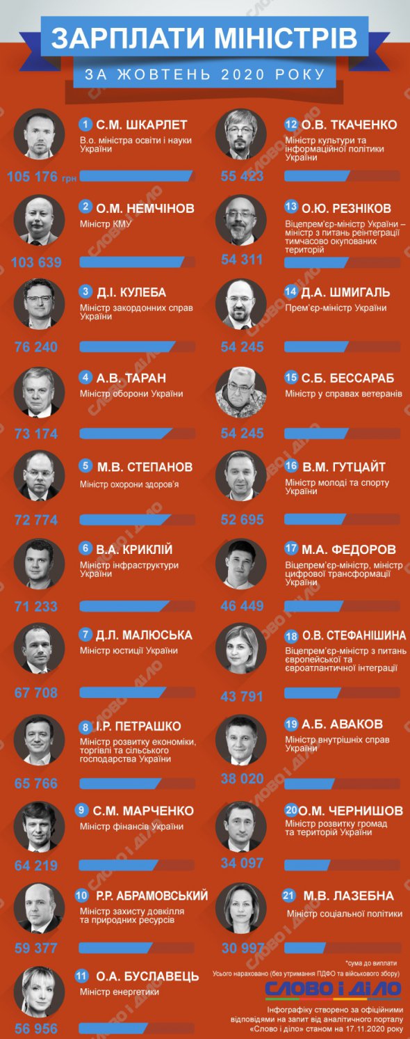 - джерело.Понад 70 тис. заробили міністр закордонних справ Дмитро Кулеба, оборони – Андрій Таран, охорони здоров’я – Максим Степанов та інфраструктури Владислав Криклій.