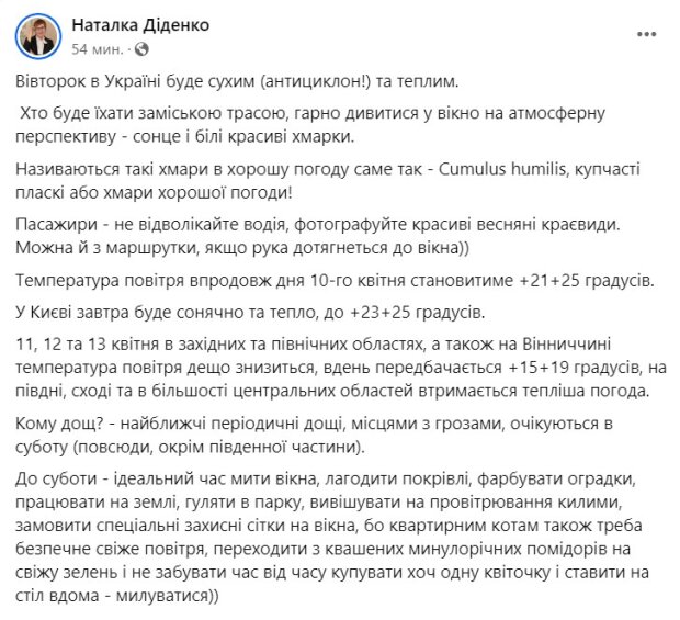 За повідомленням народного синоптика Наталки Діденко в Україні завтра, 10 квітня, сухо, тепло та яскраво. Температура повітря протягом дня становитиме в переважних показниках +12 – +25 градусів. А Краєвиди так і манитимуть на відпочинок природніми просторами. Все більше хочеться вдихати весняного повітря, фотографуватися на фоні білих абрикос, збирати перші первоцвіти.